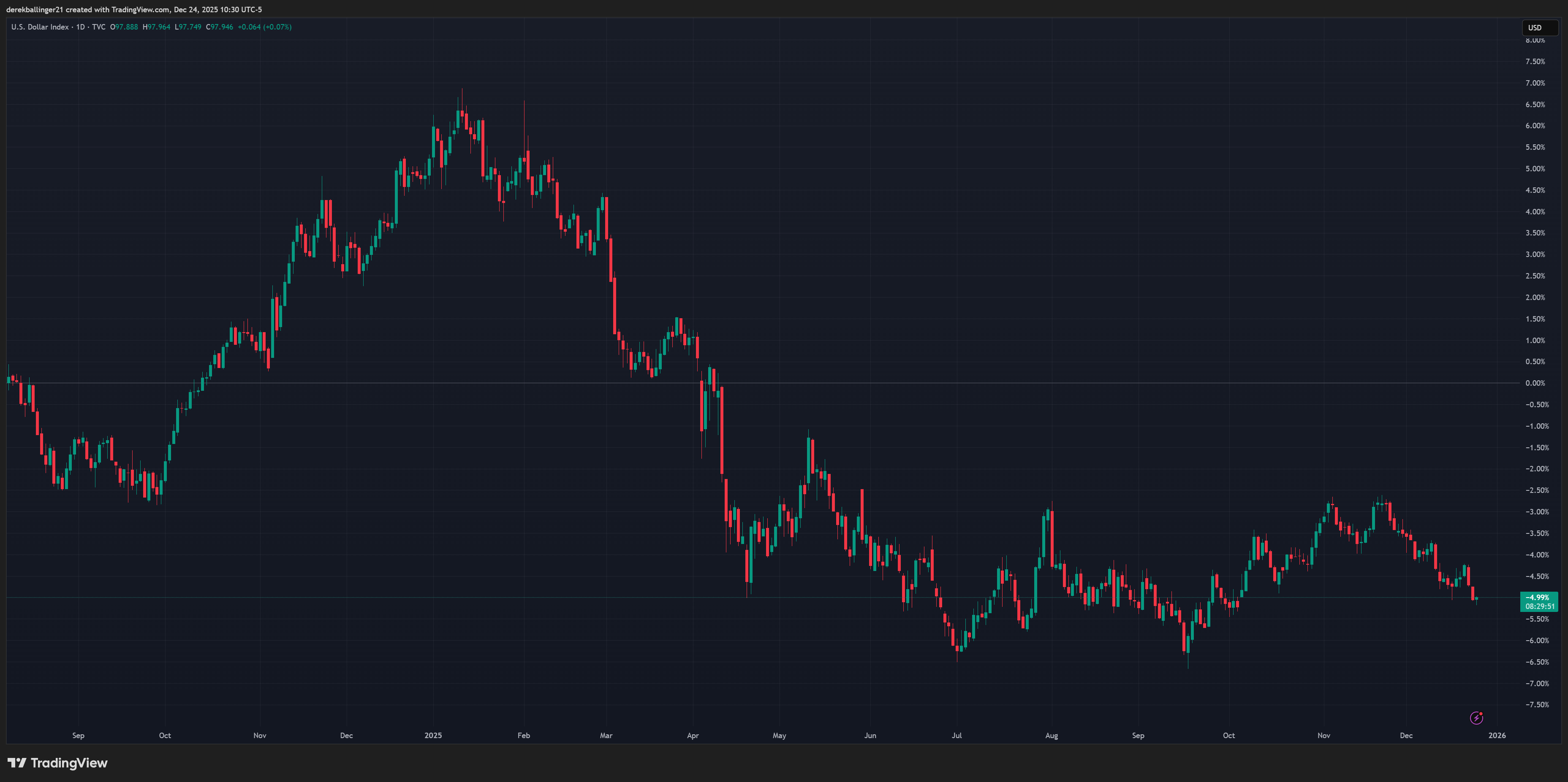 Image: DXY (US Dollar Index YTD Returns as of 12/24/2025)    Source: Trading Viewhttps://www.tradingview.com/chart/IhZDMXK8/?symbol=TVC%3ADXY
